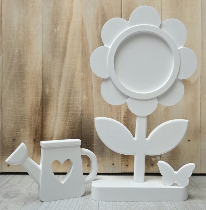 BUNDLE “Blüte” Variante 1 – Set bestehend aus einer Buttonblume, einen Sockel rechteckig für 1 Blume, eine Gießkanne 6cm und einen Mini-Schmetterling als Gratis-Goodie.