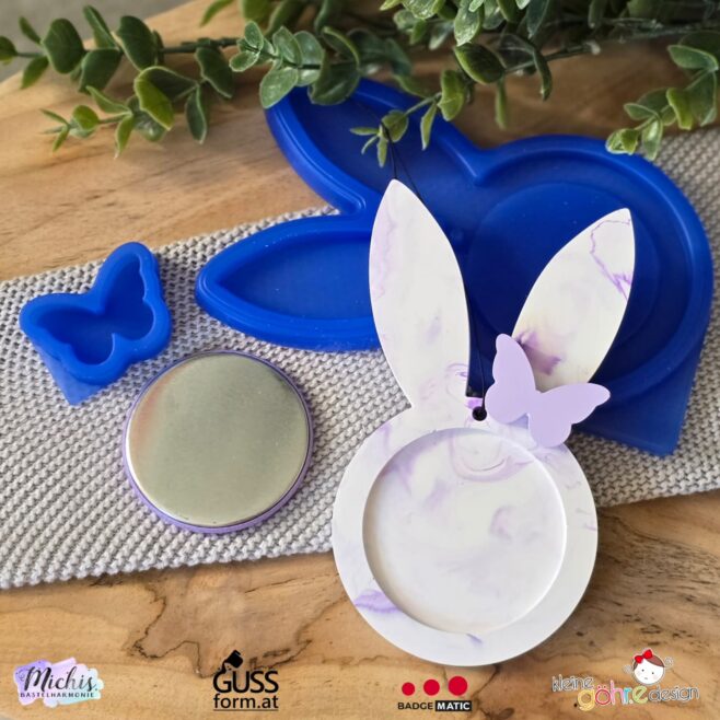 BUNDLE “Hasenei” – Silikonformen-Set bestehend aus einem Buttonhasen, einem Button-Ei und einem Mini-Schmetterling als Gratis-Goodie.