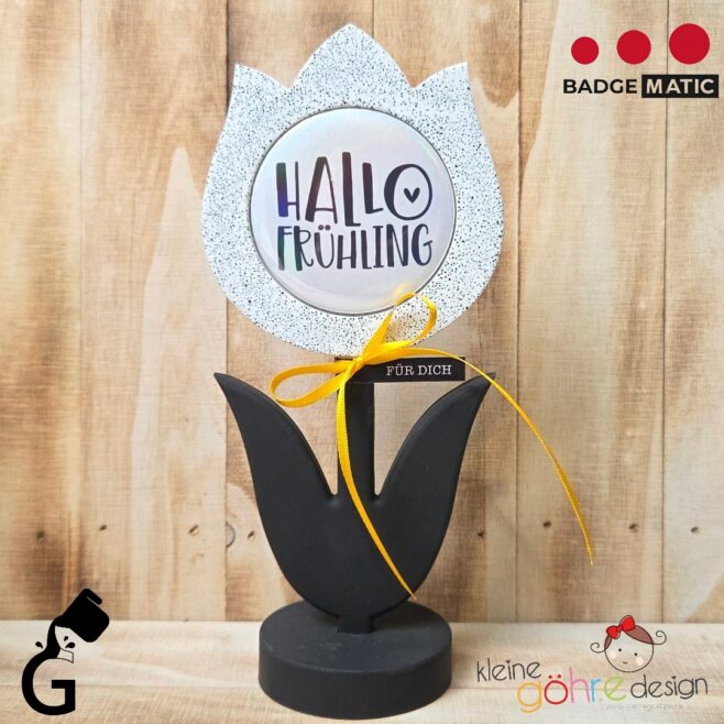 BUNDLE “Knospe” Variante 2 – Set bestehend aus einer Buttonblume “Tulpe”, einen Sockel rund für 1 Blume, eine Gießkanne 6cm und einen Mini-Schmetterling als Gratis-Goodie.