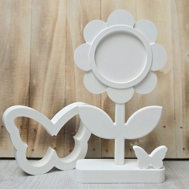 BUNDLE “Wiese” Variante 1 – Set bestehend aus einer Buttonblume, einen Sockel rechteckig für 1 Blume, einen Schmetterling “Umriss”,  eine Gießkanne 6cm und einen Mini-Schmetterling als Gratis-Goodie.